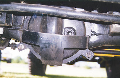 Right: (25Kb) The Rover diff is well known for the very thin steel cover over the crown wheel and for the fact that the crown wheel is so close to the cover. A slight hit on the cover will see the crown wheel chew a hole through the cover in short order. The oil then tends to come out! This diff guard is one photographed on another Rangie, that's why it is slightly different in appearance.