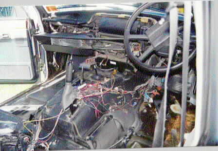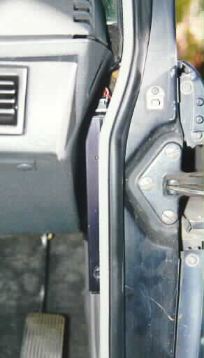 Right: (16Kb) This view is looking at the gap between the door pillar and the lower fascia panel under the dash. Note how the EFI computer (the slim black bit) has been slid up into that gap.
