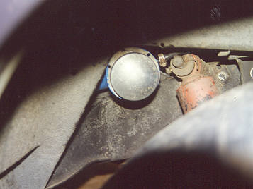 Right: (15Kb) The bonnet light switch mounting hole also needs opening up to allow it to be moved slightly up and out to clear the snorkel . Alternatively, you could relocate this switch across to the RHS of the bonnet. I couldn't do this because that position was taken by the burglar alarm switch.
