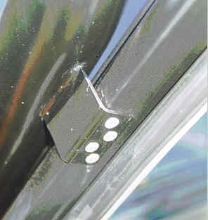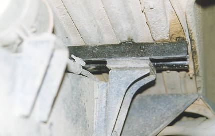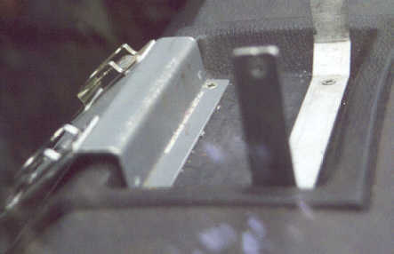 Left: (8Kb) 75mm pipe won't fit through the bonnet (hood) closing faces unless the bonnet and the decker panel are opened up. These pix show how much metal has to be filed away. It looks worse than it is because the bonnet had to be lifted a bit for me to take the photo.