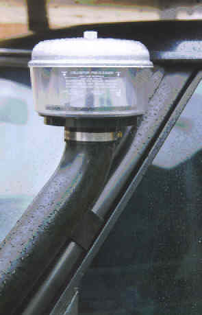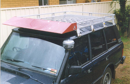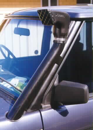Right: (15Kb) Whilst the majority of serious (and some not so serious) 4WDs in Australia have commercially available snorkels, until recently these were not available for the Range Rover. Now that they are, the ones I've seen are pretty ugly fibreglass mouldings - and all snorkels, regardless of the 4WD to which they are to be fitted, are expensive. So why not make one's own? This one is merely 75mm (3") steel exhaust pipe, bent to shape. The ram on the top is the Safari Snorkels ram (possibly made by Donaldson, the US filter company - it looks like theirs).