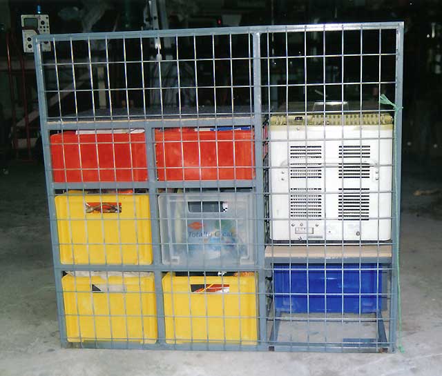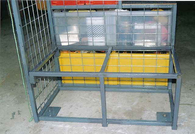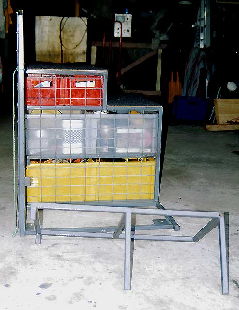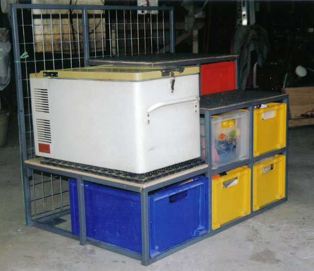 Left and right: (35Kb and 50Kb) I didn't want everything in the back floating around as I bounced around in the bush - or coming into the front of the cabin, so I made up this storage unit for my stuff when I went camping. It holds the Engel 29 litre fridge, 1 x 26 litre drawer, 8 x 15 litre drawers and 4 x 6 litre drawers. I built in a cargo barrier as well - see pix (right). The frame is made from 20mm square steel tubing welded together. The drawers shown here upside down have a lip at the bottom and just drop into place so they can't slide out. There is enough clearance at the top of the drawer to allow the drawer to be lifted clear and slid out. Click here to see how the bottom of the drawer slides between the square steel tube runners (also note the mesh between the drawers so that if a drawer does bounce out of the runners, it can't move sideways into the adjoining drawers - if that makes sense).