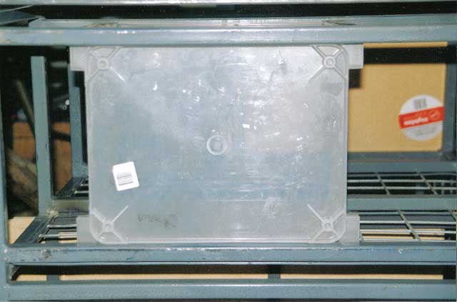 Left: (12Kb) Similar view to that above but this time without the lower fascia in place. To fit the ECU here meant knocking down a flange on the kick panel. Don't forget this is a RHD vehicle so it's probably back to front for LHD vehicles. That black rubber tube is a vacuum line for the MAP (manifold absolute pressure) sensor. The bottom edge of the ECU is level with the bonnet release handle. It gave me 12 inches (300mm) more freeboard! I originally planned to seal the case with silicone rubber but experience with sealing radio control systems for model boats makes me know better. The acetic acid released by many silicone rubbers promotes corrosion of the electronics.