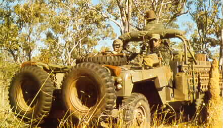 According to the accompanying article in Overlander magazine Feb/Mar 1978, these Rovers had the chassis lengthened at the front to carry jerry cans of water (I guess behind the spare wheels) in addition to the visible water jerry cans beside the soldiers. In total, they carried 160 litres of water because they would be operating in the dry northern Australia. The total fuel capacity was 360 litres in fuel tanks, not jerry cans.
