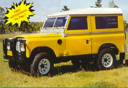 Left: (20Kb)The Australian Land Rover Game. Yes, folks, this is how they came out of the Factory in Australia - a bright yellow SWB station wagon with wide Sunraysia white spoke wheels and a bull bar. You can just make out the word "Game" on the bottom of the front mudguard [wing (Britain) or fender (US)]. Photo stolen off Just 4x4's classified magazine Feb 1997.