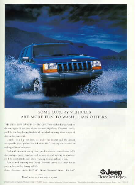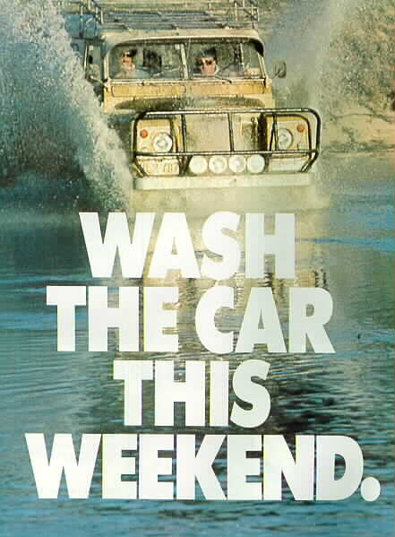 Left: (28Kb)"Some Luxury Vehicles Are More Fun To Wash Than Others" I wonder from where Jeep got this idea? Admittedly, a Series Landie could hardly be called a luxury vehicle. Reprinted from December 1996 Australian Overlander magazine.