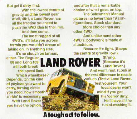 I'm still working on this page. More will be coming when I find some more interesting adverts. Don't forget to check the other adverts for Discos, Rangies, Defenders and, of course, Freelanders. If you know of any humourous ads, I'd be interested in seeing them.